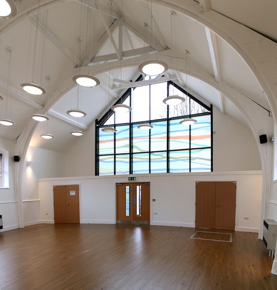 It has its own entrance on the South side of the building via a gentle ramp and steps. Lighting is dimmable. The kitchen servery opens directly into the Hall. Chairs and tables are available.